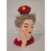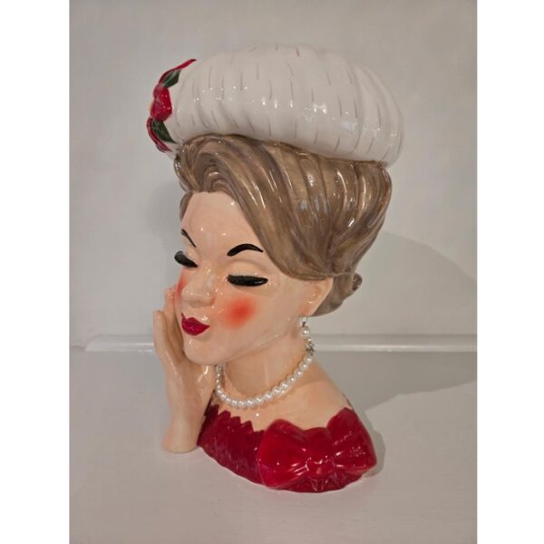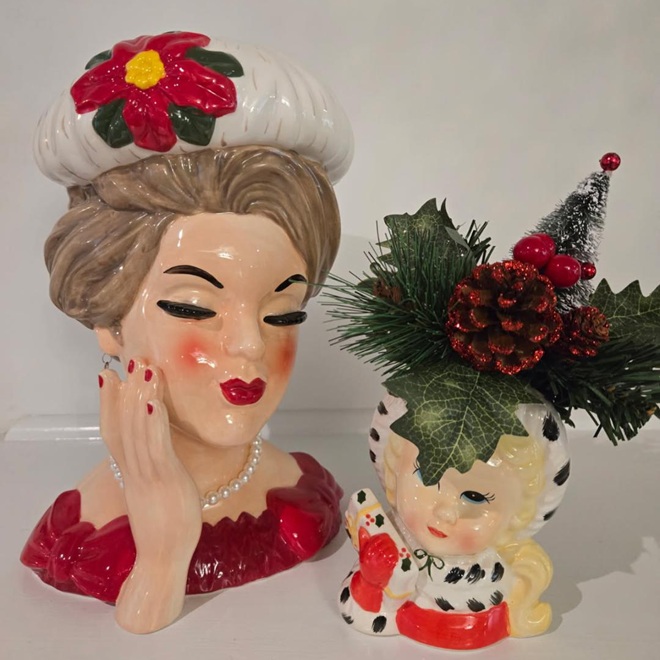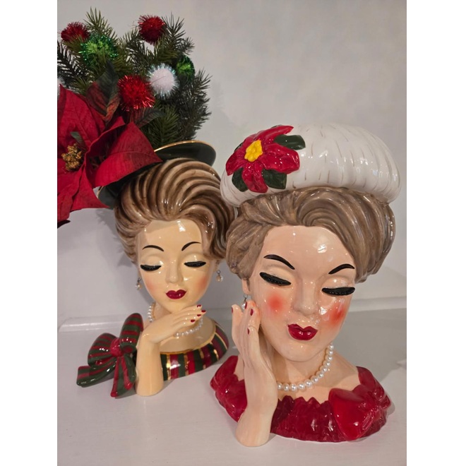 Our retro Jumbo Christmas Lady Head Vase is a throwback in time! This new interpretation of the classic is elevated in both size and style. Elegantly adorned with a pearl necklace and earrings, a white hat with poinsettia accent, vibrant red lips and rosy blush on her cheeks, this nostalgic beauty looks ready holiday hosting- just add flowers! From her shapely brows and thick lashes to her impeccable accessory selections, she’s the perfect depiction of mid-20th-century holiday style. This retro-inspired “Head Vase” is modeled after the petite beauties that filled American homes during the ‘50s and ‘60s. Originally produced by florist companies to hold the bouquets they sold; their small size helped maximize sales by limiting the number of blooms each container held. At twice the scale, adoring “Head Hunters” will find this vintage-inspired Christmas beauty simply irresistible! The jumbo Christmas Lady Head Vase is made of ceramic with pearl accents. The artisan details of this hand-painted vase mean minor imperfections should be expected. No two are painted exactly the same! Approximately 12” high. Sold individually.